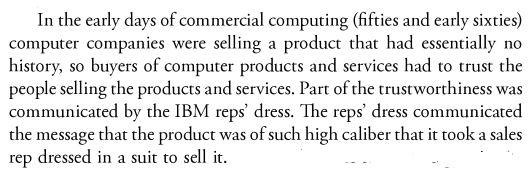 Libraries are liberal hubs of information, but can be rather conservative when it comes to fashion. White is by far the safest color – not only is it the easiest color to match with, but also the most trustworthy. IBM was famous for conducting studies back in the 50’s and 60’s on colors and styles that made their people look the most confident and trustworthy. Here’s a snippet on from Donald Egolf’s book The Nonverbal Factor: