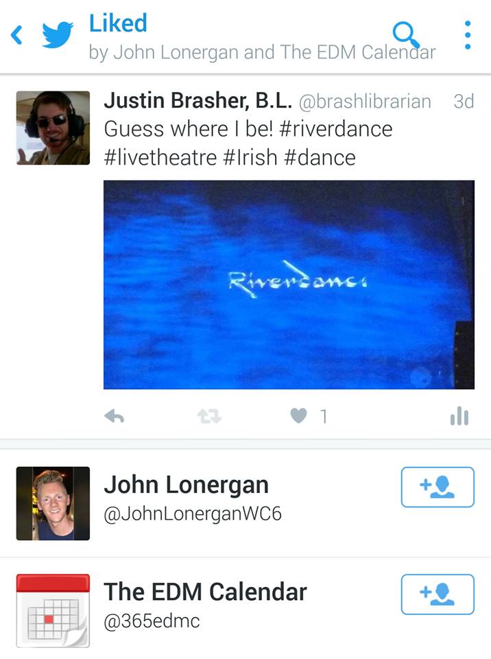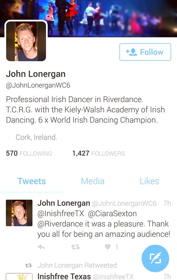 Okay, hashtags are a passive way to identify information and make it easier to find, whereas @ symbols are used to directly send it to somebody. (Like you’re speaking @ them, how clever!). To me, this kind of interaction on social media is vital. People like being noticed and appreciated, especially by world-class organizations and performers; I think a large part of it is just knowing that there’s somebody on the other end and not just a robot. With that, I thank John and the whole Riverdance group for totally making my day.